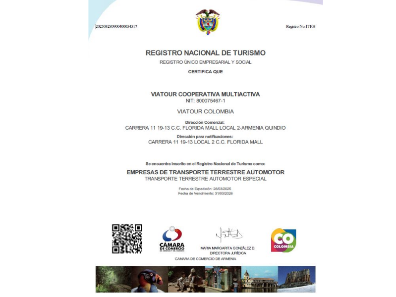 “Viatour Cooperativa es una empresa de transporte debidamente inscrita y certificada en el Registro Nacional de Turismo (RNT), cumpliendo con los requisitos legales vigentes para la prestación de servicios turísticos en Colombia.”